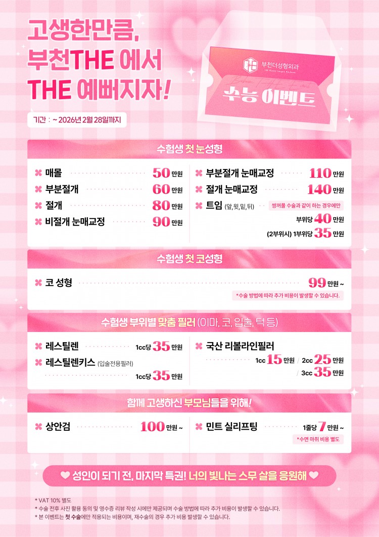 수험생이벤트 페이지 정보 작성자 부천The성형외과 댓글 0건 조회 33회 작성일 25-11-12 16:50 목록 본문 수험생이벤트 다음글개원20주년기념이벤트 25.07.17 댓글 0 댓글목록 등록된 댓글이 없습니다.